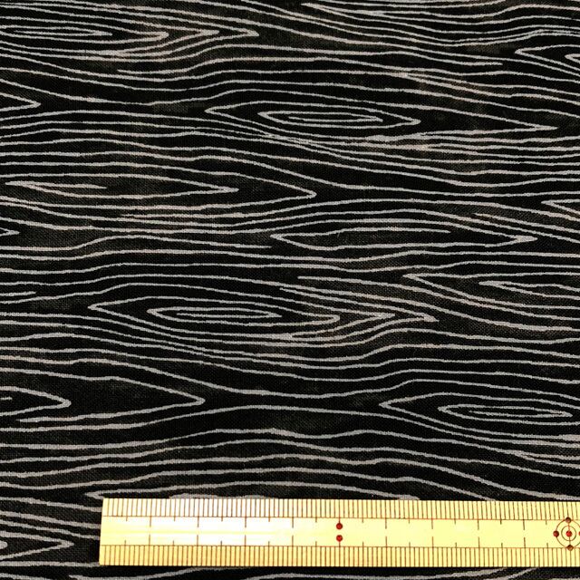 黒地に白で木の年輪がデザインされたプリント生地です。